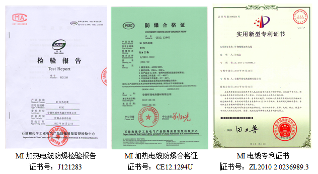安徽環(huán)瑞MI發(fā)熱電纜獲得了國(guó)家專利證書(shū)及石油化工協(xié)會(huì)頒發(fā)的防爆合格證.