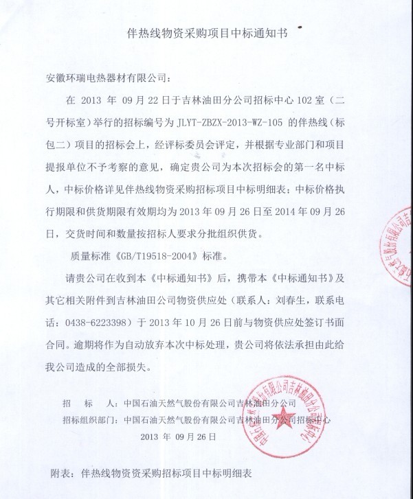 此次成功競標(biāo)吉林油田,也是甲方在去年使用過我司的電伴熱帶后做的慎重選擇,是對于我司電熱帶產(chǎn)品質(zhì)量的主要肯定。 本次項目包括自限溫、恒功率電熱帶兩大系列。目前正在緊張的進(jìn)行后續(xù)的項目合作中。以下為環(huán)瑞中標(biāo)通知書