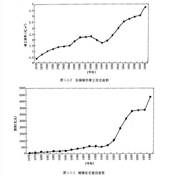 我國地域廣闊.人口眾多.房屋建筑規(guī)模巨大。其中住宅建設(shè)約占居住建筑的92%.而住宅,是世界各國都面臨的社會問題。“人人享有適當(dāng)?shù)淖》?rdquo;已成為聯(lián)合國第二次人居大會所提出的戰(zhàn)略目標(biāo)。改革開放以來.從1979年到1998年底.我國城鄉(xiāng)新建住宅建筑面積158億 ㎡其中城鎮(zhèn)住宅宅 約35億 ㎡.農(nóng)村作宅約123億MI.全國城市人均居住面積從3. 6 ㎡增加到9.3 ㎡(圖一1一1).竣 工面積從3 752萬 ㎡增加到47 600萬 ㎡(圖1-1-2).城鎮(zhèn)住宅建設(shè)投資從39.21億元增加到4 310.81億元(圖1-1 3). 1.7億戶遷入新居."八五"期間共完成城市住宅建設(shè)投資8 543億元.竣工 住宅10.5億 ㎡,僅1995年住宅竣工面積3.3億 ㎡.比“七五”期間增長76%.九五.期間計劃建設(shè) 住宅12億 ㎡,比“八五”期間增長14.3%.到1999年底。我國設(shè)城市加為668個.當(dāng)年全國城市新 建房屋竣工面積4.362 5億㎡.其中住宅2.971 6億㎡.當(dāng)年底.全國住宅總使用面積為30.505 2億 ㎡.總居住面積為21.011 2億㎡.人均使用面積達(dá)到14.2 ㎡.人均居住面積達(dá)到9. 8 ㎡分別比上 年增長0.6和0. 5 ㎡.居民生活條件大有改善。住宅建設(shè)量大面廣.至今仍呈上升趨勢.而且這個 上升趨勢還將持續(xù)20-30年。由此看出,我國住宅建設(shè)正處于快速發(fā)展階段.不僅是中國歷史上的 最高峰.也是世界上任何一個國家所不可比擬的。