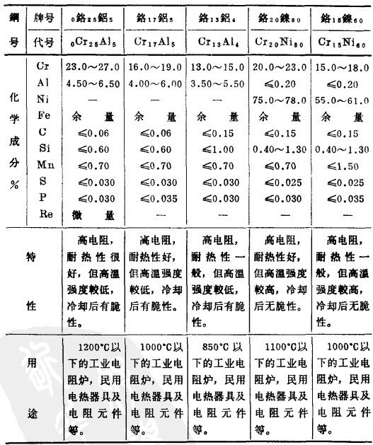 可以用做電熱體的材料是很多的,主要分為金屬電熱體和非金屬電熱體。金屬電熱體又可分為貴金屬及其合金(如鉑、鉑依等),重金屬及其合金(如鎢、鉬等),鎳基合金(如鉻鎳、鉻鎳鐵等)及鐵基合金(如鐵鉻鋁、鐵鋁等)等。在所有的這些金屬電熱體中,應(yīng)用比較廣泛的是鎳基合金和鐵基合金。跳是比較稀少的元素,就鎳所具有的特性用于其他合金更為合適,如高性能的磁性材料,及其他高溫高強(qiáng)度及特殊物理性能的合金等是不可缺少的。我們應(yīng)當(dāng)把電熱合金的生產(chǎn)立足于國內(nèi),因此在電熱合金中節(jié)省鎳和不用鎳是非常重要的。
