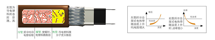 自限溫電熱帶的帶芯是一種很復(fù)雜的高分子復(fù)合物,它由多種材料和導(dǎo)電介質(zhì)復(fù)合而成,經(jīng)過特定的化學(xué)變化和物理處理之后擠出成型,在兩條平行導(dǎo)線之間組成的一條保持連續(xù)平行的加熱原件。在加熱過程中,這個高分子材料的內(nèi)部半導(dǎo)體通道的數(shù)量----電阻發(fā)生了驚人的正溫度系數(shù)(簡稱PTC效應(yīng))的變化,且具有特殊的分子記憶能力,而且這種記憶性反應(yīng)強烈。當(dāng)環(huán)境溫度升高時,高分子聚合物微分子膨脹,碳粒漸漸分開,引起了電路中斷,電阻上升,伴熱線自動減少功率輸出;當(dāng)環(huán)境溫度降低時,高分子聚合物微粒間距又收縮變小,碳粒相應(yīng)連接起來形成電路,伴熱線發(fā)熱功率又自動上升;當(dāng)環(huán)境溫度處于某一穩(wěn)定狀態(tài)時,系統(tǒng)將達(dá)到熱輸出穩(wěn)定,使其具有溫度自限性。它控制溫度不會過高亦不會過低,能自動調(diào)解。從而,達(dá)到了安全可靠的目的。