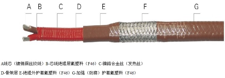 電源母線為二根平行絕緣銅線,在絕緣層中間纏繞電熱絲,并將該電熱絲每隔一定距離(即“發(fā)熱節(jié)長”)與母線連接,形成連續(xù)并聯(lián)電阻。母線通電后,各并聯(lián)電阻發(fā)熱,因而形成一條連續(xù)的加熱帶。