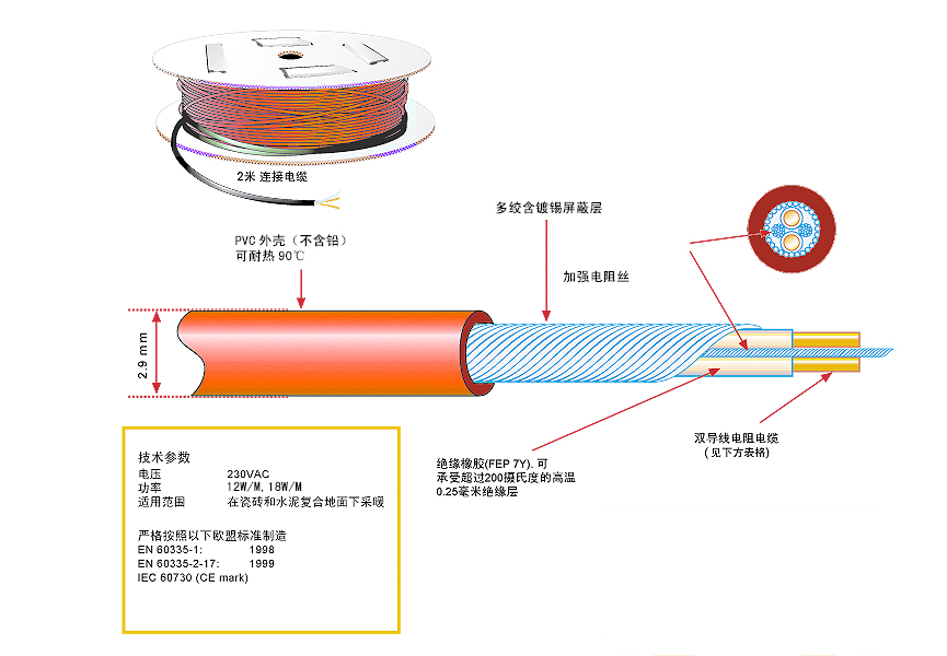 環(huán)瑞最新研發(fā)3.7毫米直徑的雙導(dǎo)電地熱線-新型發(fā)熱電纜,可滿足5毫米-100毫米不同覆蓋厚度設(shè)計。