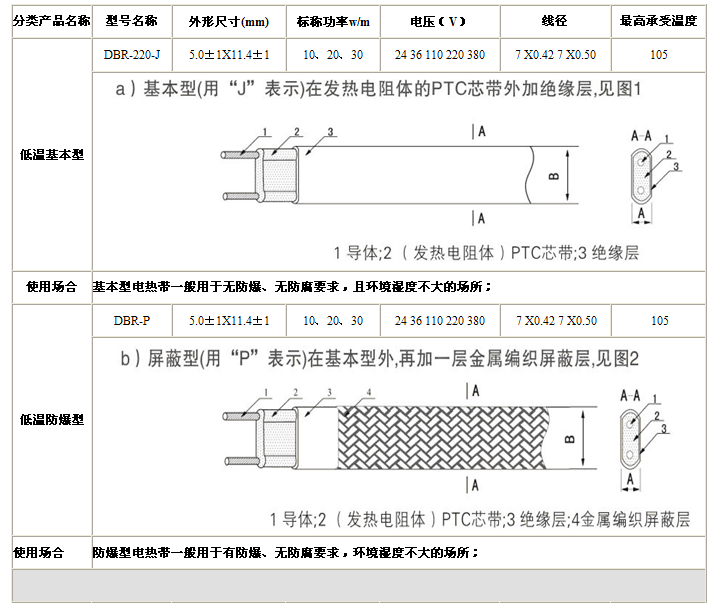 2.工業(yè)性電伴熱帶帶寬12mm-13.5mm ,具體參照上述結(jié)構(gòu)對(duì)照表