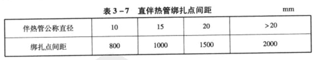 伴熱管應(yīng)與主管平行安裝,并應(yīng)自行排液。當一根主管需要多根伴熱管伴熱時,伴熱管之間的距離應(yīng)固定。水平伴熱竹宜安裝在主管下方或靠近支架的側(cè)面,鉛垂伴熱管應(yīng)均勻分布在主管周圍,不得將伴熱管直接點焊在主管上,而可采用綁扎帶或鍍鋅鐵絲等固定在主竹上。彎頭部位的伴熱管綁扎帶不得少于3道.直伴熱竹綁扎點間距應(yīng)符合表3一7的規(guī)定。