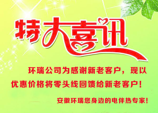 為感謝新老客戶對環(huán)瑞公司發(fā)展給予的支持,現(xiàn)有零頭線將以優(yōu)惠價(jià)回饋給新老客戶,歡迎廣大新老客戶咨詢訂購,環(huán)瑞十年專注電伴熱產(chǎn)品研發(fā),品質(zhì)保證。