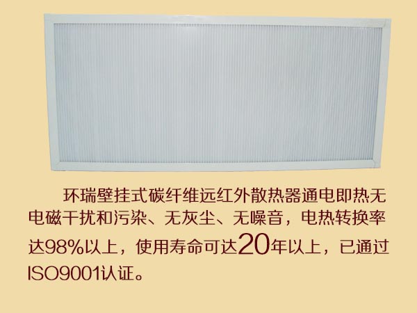 環(huán)瑞壁掛式碳纖維電暖器是采用先進(jìn)技術(shù)研制開發(fā)的一種新型電采暖的專利產(chǎn)品。采用高科技長(zhǎng)絲碳纖維材料制成,具有性能穩(wěn)定,安全可靠,環(huán)保節(jié)電,經(jīng)濟(jì)實(shí)用等特點(diǎn)。屬于國(guó)家認(rèn)定的綠色環(huán)保電加熱產(chǎn)品。