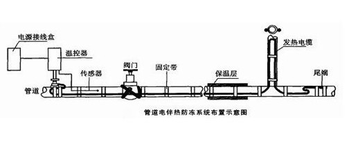 當(dāng)敷設(shè)單根電熱帶時(shí),敷設(shè)時(shí)應(yīng)盡可能使電熱帶平整地緊貼在管道表面,用聚酯帶或鋁箔膠帶固定,嚴(yán)禁用細(xì)絲捆扎,如遇法蘭、閥門等尖銳突起部分,應(yīng)注意保護(hù)。在水平管道上安裝時(shí),可敷設(shè)在管道下45度側(cè)方,用玻璃纖維壓敏膠帶或鋁膠帶每隔約30Cm處將電熱帶固定于管道上。如上圖電熱帶應(yīng)按管道長(zhǎng)度分布,以免物料在無(wú)電熱帶處降溫凝結(jié),電熱帶的長(zhǎng)度應(yīng)長(zhǎng)于被伴熱管道。在線路的第一供電點(diǎn)和尾端各預(yù)留1m長(zhǎng)的電熱帶。電熱帶在穿過(guò)墊木等支架時(shí),應(yīng)在支架上打眼穿孔,必須保證伴熱帶緊貼在管道上,再使用密封膠封堵。每個(gè)回路的電熱帶安裝完畢,再確認(rèn)整個(gè)回路長(zhǎng)度滿足設(shè)計(jì)要求后,才可剪短電熱帶。